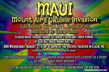Tuesdays: 1:00pm-2:30pm and 7:30pm-9:00pm at Olde Mill Music in Mount Airy, NC AND Wednesdays from 5:00pm-6:30pm at the Reeves Theater In Elkin, NC. All ages welcome. Seven and under should take the course with an adult.